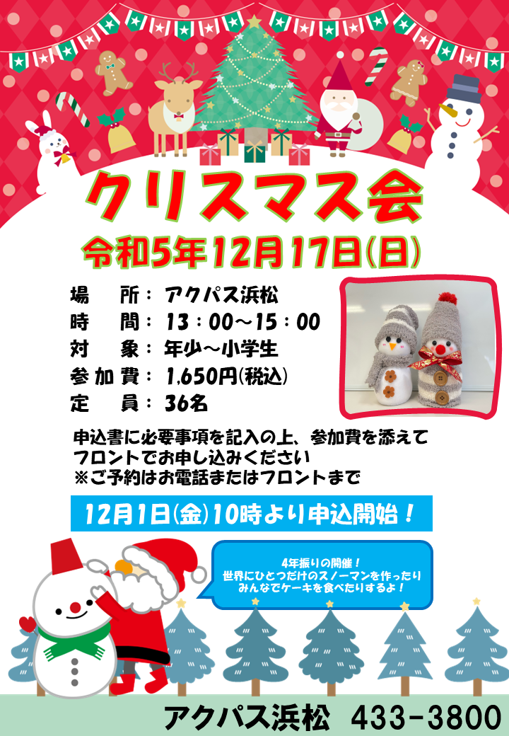 投稿日 2023/11/20 カテゴリー TOPICS 4年ぶりのクリスマスイベント開催🎄!! 12月17日(日)にクリスマス会を開催します🎅🎄 世界にひとつだけのスノーマン⛄を作ったり みんなでケーキを作って食べたりするよ!! ⛄雪だるま⛄がいっぱいのクリスマス会にしよう!! 時間:13:00~15:00 参加費:1,650円(税込) 対象:年少~小学生 定員:36名 ご予約やお申込みはお電話またはフロントまで ※ご予約やお申込みは12月1日(金)10時からです※ ↓詳しい内容コチラ↓※画像をクリック(タップ)すると拡大されます