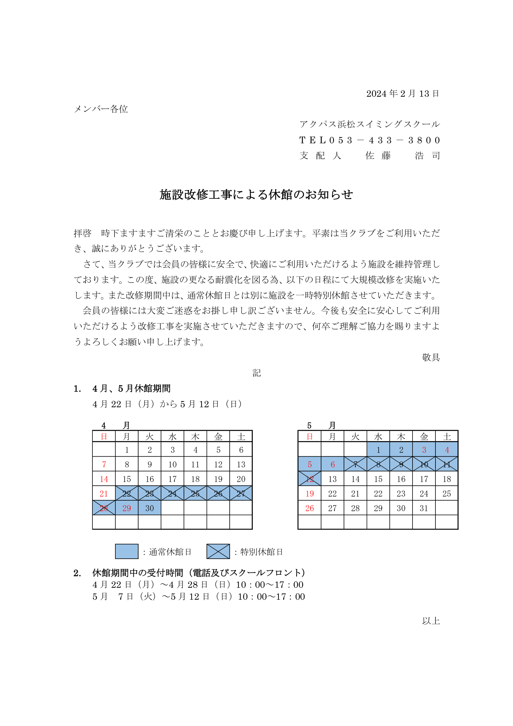 投稿日 2024/2/13 カテゴリー TOPICS 日頃より、当クラブをご利用いただき、誠にありがとうございます。 この度、当施設の更なる耐震化を図る為、以下の日程にて改修工事を実施いたします。 ↓詳しくはこちらをご覧ください↓※画像をクリック(タップ)すると拡大されます