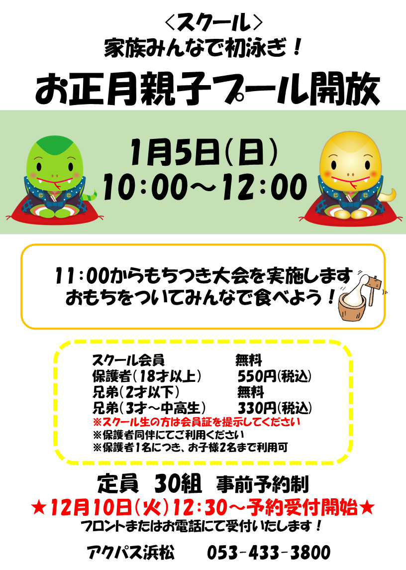 投稿日 2024/12/5 カテゴリー TOPICS 家族みんなで初泳ぎ! 1月5日(日) 10:00~12:00 親子プール開放&もちつき大会を実施します! おもちつきは11:00からスタートします♪ 定員 30組 事前予約制 ★12月10日(火)12:30~予約受付開始します★ フロントまたはお電話にて受付いたします! 詳しくはコチラ↓