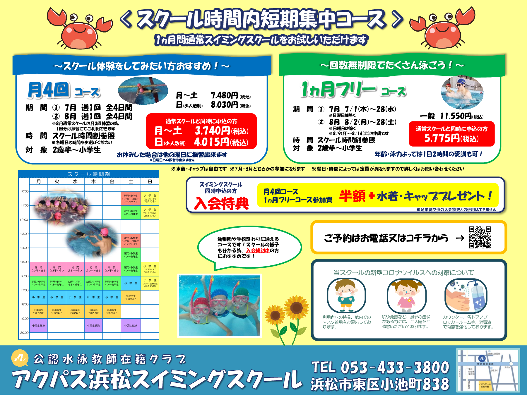 7月 or 8月の1ヶ月間通常のスイミングスクールをお試しできるコースです。