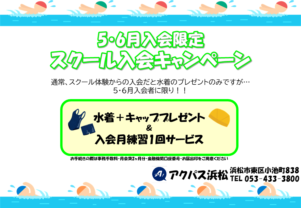 投稿日 2022/6/1 カテゴリー スイミングスクール ★5・6月入会限定★ スクール入会キャンペーン 通常スクール体験からの入会だと指定水着のプレゼントのみですが 5・6月入会に限り指定水着+キャップをプレゼント!! さらに!!入会月に練習1回サービス★ この機会にぜひご入会ください!! ↓入会キャンペーンの詳しい内容はコチラ↓※画像をクリック(タップ)すると拡大されます