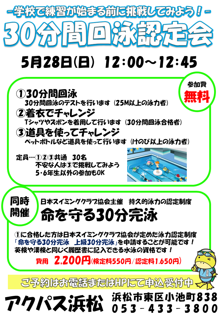 5/28(日)30分間回泳認定会のお知らせ
