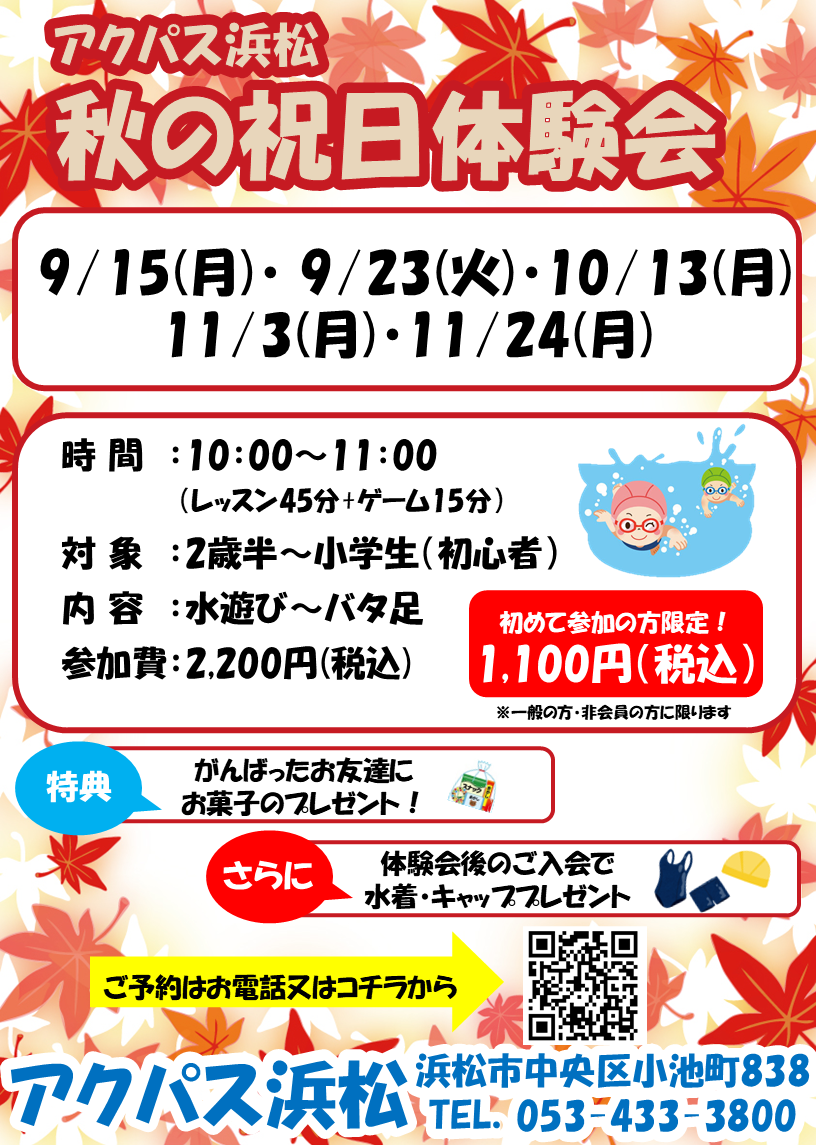 スポーツの秋!はじめてのスイミングは祝日体験会で!!